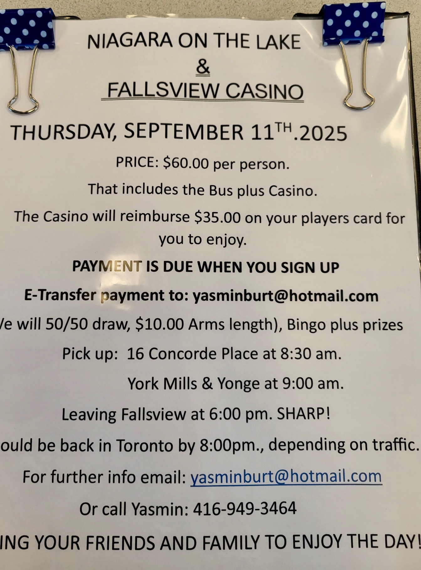 From: Fran Boyce Sent: August 13, 2025 4:16 PM To: webmail@wynfordtowerresidents.ca Subject: News Hello Bill, Please can you post this on the newsletter. This is a trip to Niagara on the lake & Fallsview casino on Sept 11/25. Thank you, Fran ![]() |
