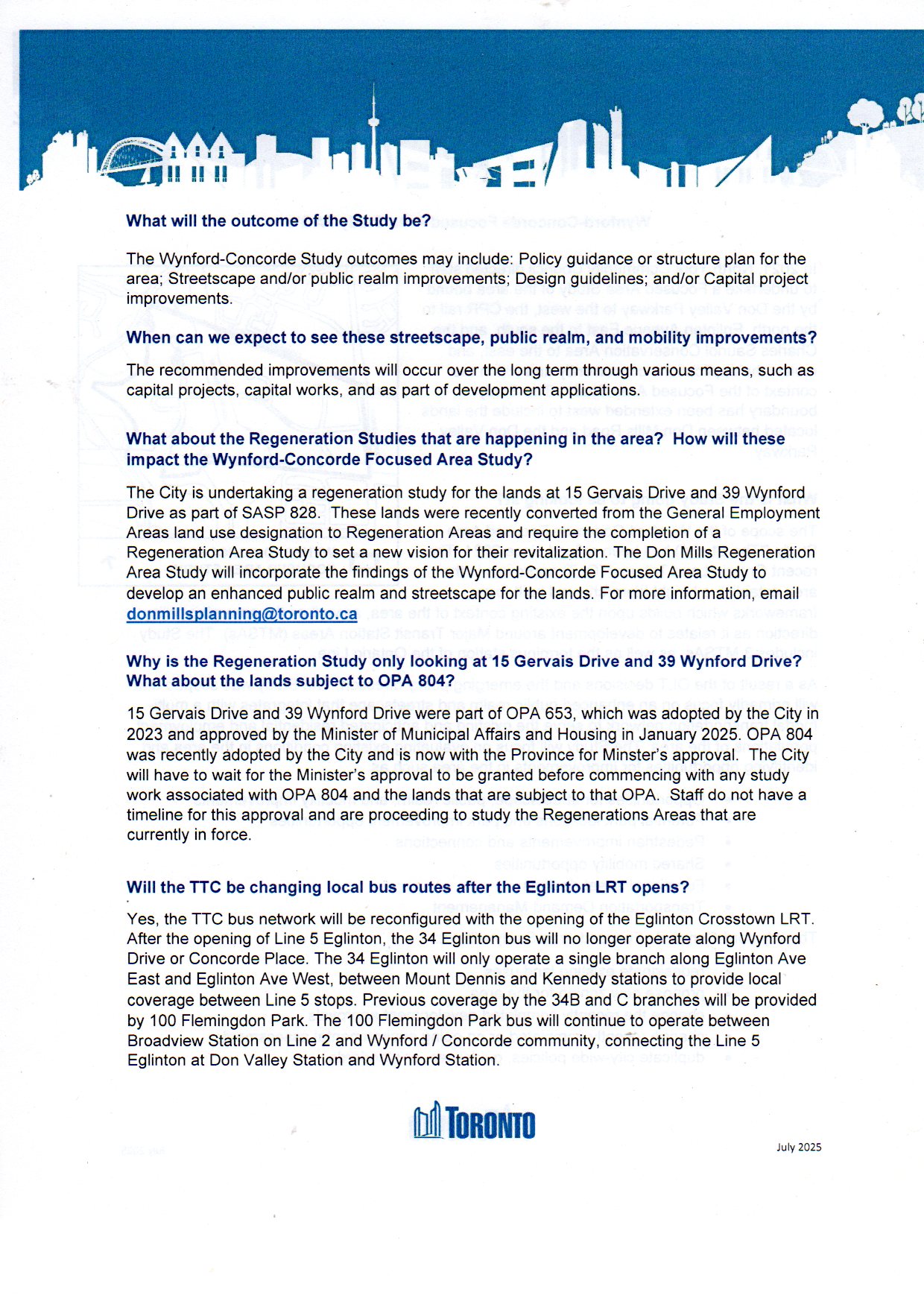 The Wynford Concorde Focused Area Study at the Japanese Cultural Centre Thursday evening was interesting in that the City of Toronto seems to be trying very hard to improve the streetscape in the area. There was no mention of building development. The following handouts do not include any of the artist conceptions that were on display. One idea is to make Wynford Drive and Concorde Place 1 lane each way with a centre lane for left turns, separated bicycle paths, wide sidewalks, benches and lots of trees. Almost bucolic, although I don't know if the thosands of new residents who will arrive with the new residential towers have been considered. The links at the very end of the documents below are not live. They have to be copied into the address box of your browser or email program. ![]() ![]() ![]() ![]() |